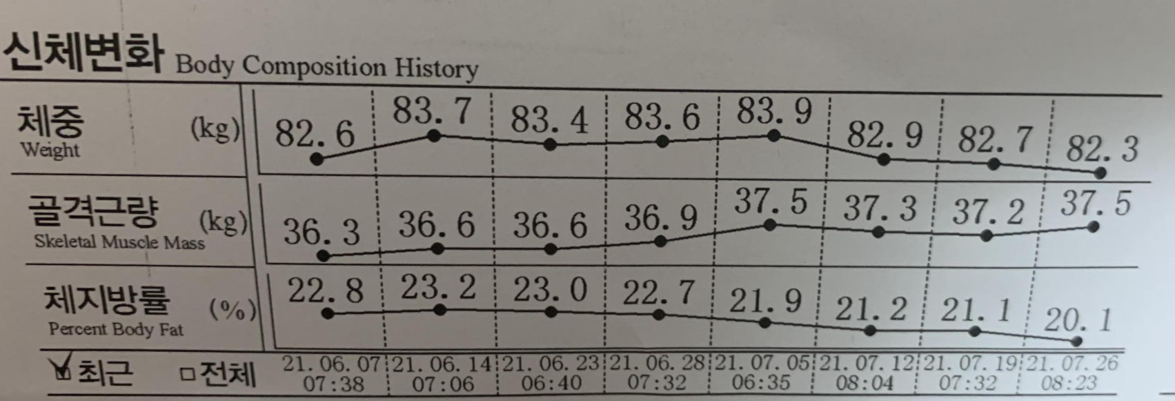 7월 한 달은 그래도 운동 꾸준히 계속했어서, 그나마 결과는 나쁘지 않은 편이다.