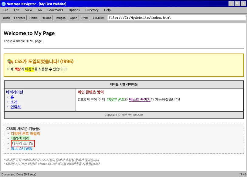 표현 방식은 단순했지만, 기본적인 색상과 폰트 조정이 가능해지면서 웹 디자인이 한 단계 발전하는 계기가 되었습니다.
