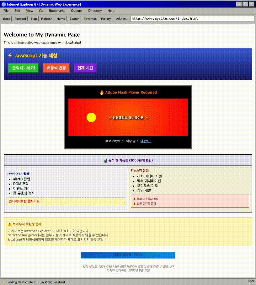 이 시기 또 하나의 주인공은 Adobe Flash였습니다. Flash는 인터랙티브한 애니메이션과 멀티미디어 콘텐츠를 구현할 수 있는 사실상의 표준으로 자리 잡으며, 화려한 웹사이트와 온라인 게임, 영상 스트리밍까지 가능하게 했습니다. 당시 인터넷을 경험한 많은 사람들에게 Flash로 만들어진 화려한 로딩 애니메이션과 음악 플레이어는 웹의 새로운 세계를 보여주었습니다.